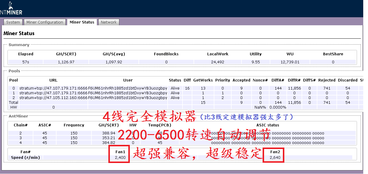 三线拟速器(模拟器)都是定速的,闲鱼上有些卖可调速,其实是增加一个可变电阻手动调节转速,也是定速的。闲鱼上有些卖四线是假四线的,最后一条控制线是空的。最好通矿机后台查看转速,一般启动是6000转左右,然后根据温度调整风扇转速(2000-6000转等) .