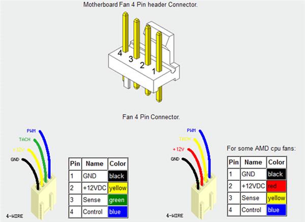 四线风扇(黑,红,黄,蓝):增加控制线,可以通过PWM信号实现转速快慢。新型CPU风扇,显卡,矿机风扇全部使用这种接口。