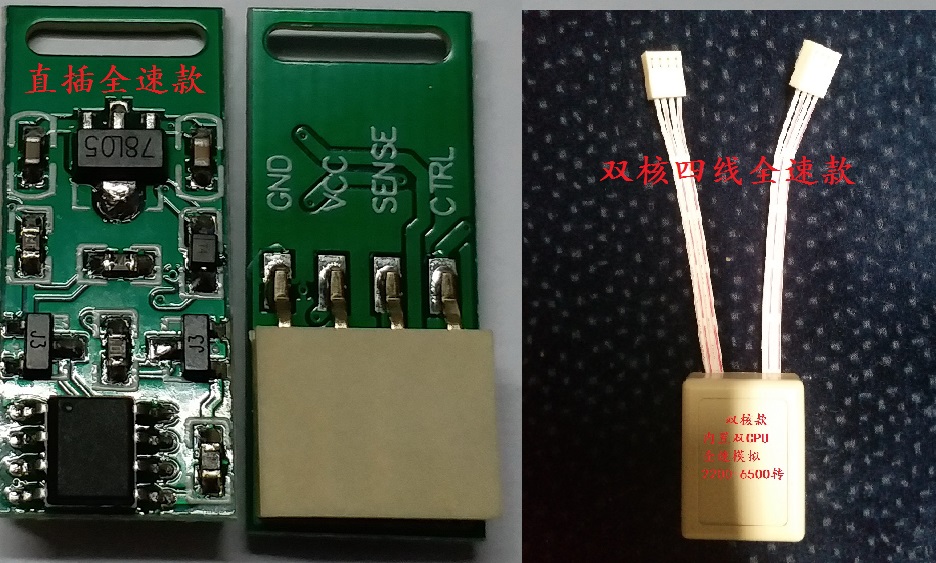 全速款(又称四线款):全速就是完全模拟出风扇的工况,实现2000-6500转完全模拟转速,例如矿机启动时需要高转速启动,然后低转速工作,并且根据机子工作温度不断调节风扇转速的。全速款模拟器完全可以实现所有工况,稳定性和兼容性相当好,只要接口形状对应,不存在不能启动矿机的情况。而且对于某些矿机来说,使用全速款模拟器算力更高一些,更稳定一些。